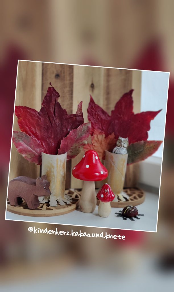 Die Klorolle wird mit einer Zackenschere unten eingeschnitten, die Zacken werden nach außen gebogen als „Wurzeln“ und Standhilfe. Der „Baumstamm“ kann zum Beispiel mit goldenem Klebestift ganz einfach verziert werden. Oben werden seitlich zwei keilförmige Einschnitte für die Blätter gemacht. Die gepressten Herbstblätter haben wir mit rotem Glitzerklebstoff verziert. Anschließend werden sie oben eingesteckt.