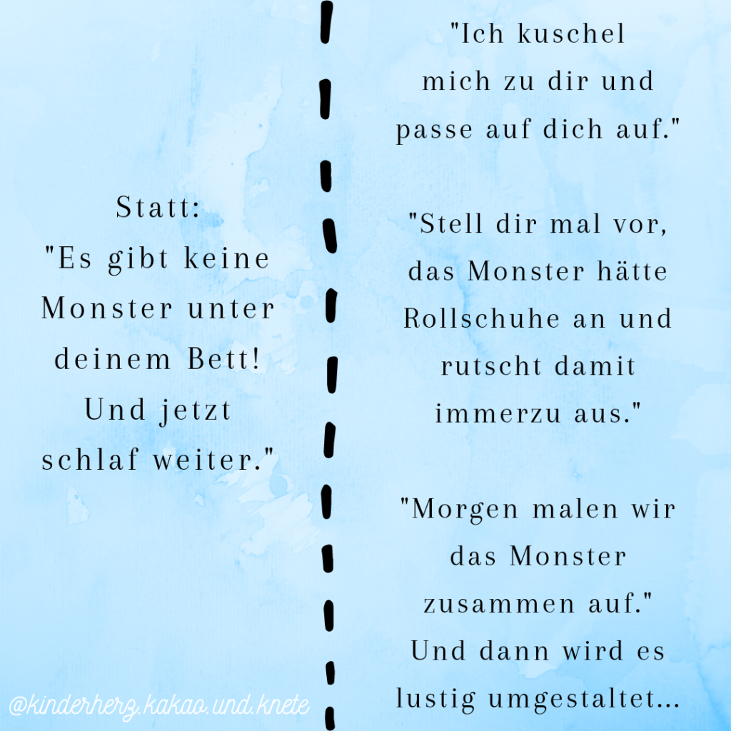 Einfach zu sagen: „Da ist nichts!“ lässt das Kind eher schlechter fühlen – die Angst geht nicht einfach fort, das Kind wird in Zukunft vielleicht nicht mehr darüber sprechen, weil MaPa ja kein Monster, Gespenst oder bösen Hai sehen können … Vielleicht fühlt es sich auch falsch mit seiner Angst.