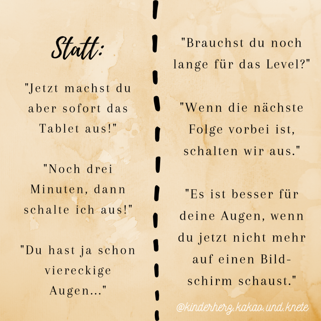 Das Wichtigste ist aber mit Sicherheit, den Kindern einen gesunden Umgang mit Medien zu vermitteln und zwar nicht nur bezüglich der Dauer. Die Kinder müssen ebenso lernen, auf ihre Körpersignale zu achten – sind meine Augen trocken? Blinzle ich genug? Ist der Abstand zum Bildschirm okay? Glühen meine Wangen schon, weil ich bereits sehr lange fernsehe/spiele? Wann habe ich zuletzt etwas getrunken? Bin ich entspannt oder vom Daddeln ganz aufgeregt?