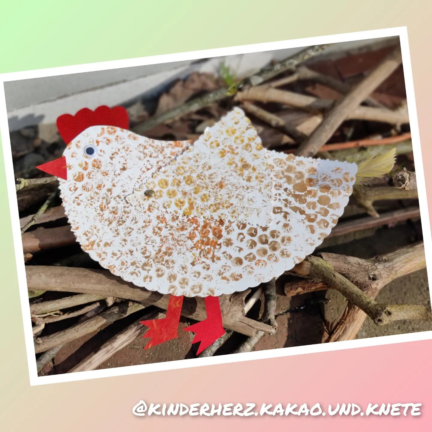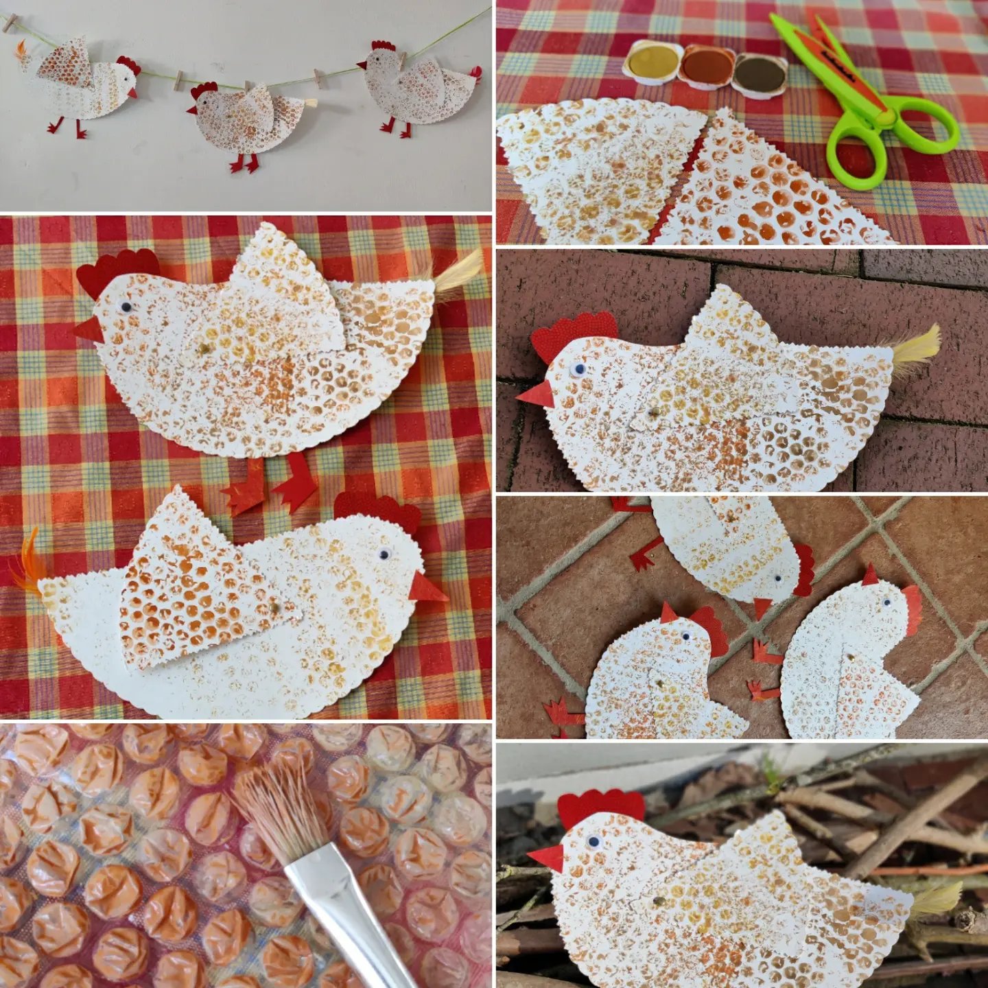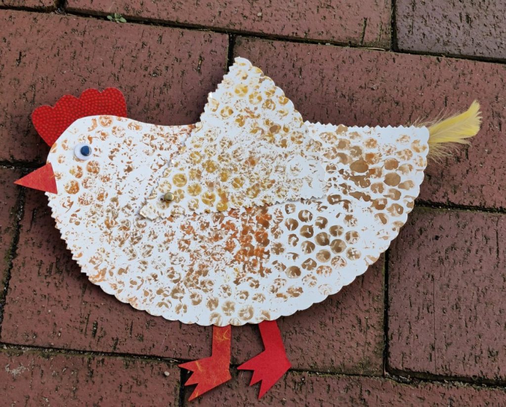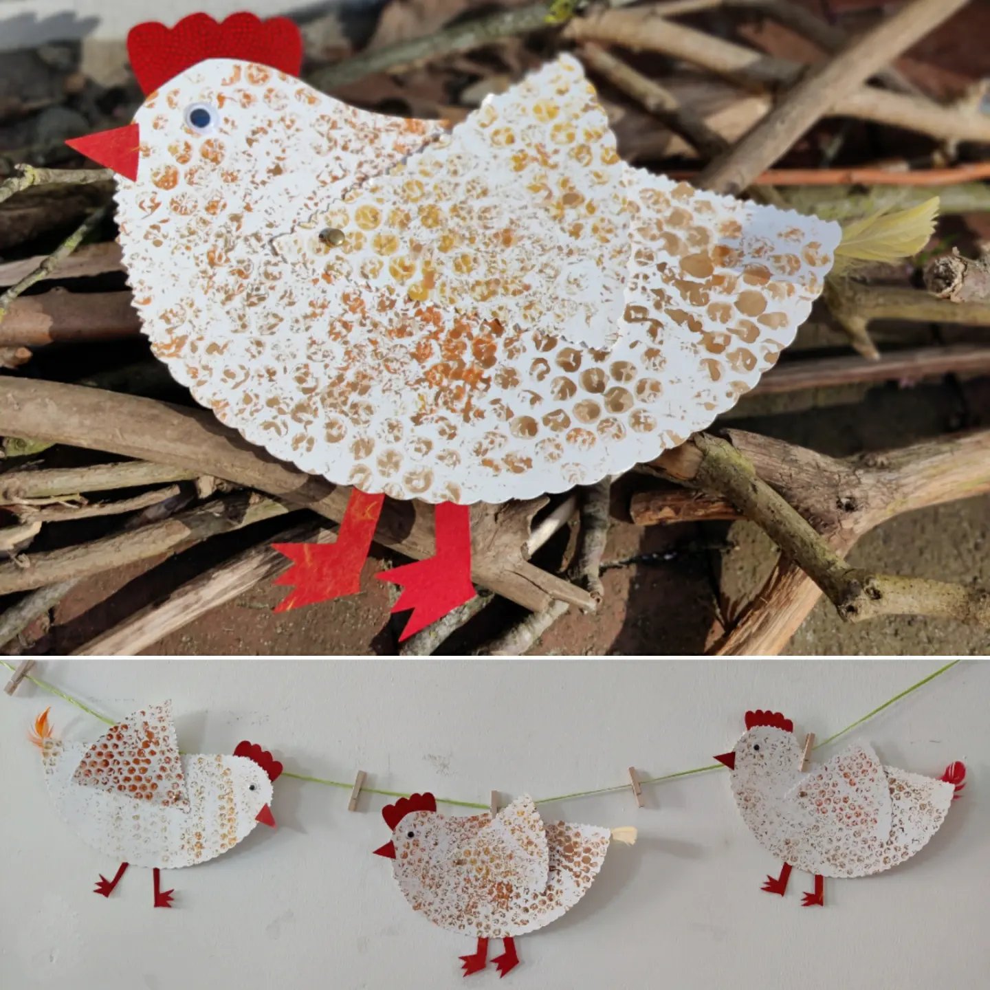 Diese hübschen Hühner haben wir aus Tortenböden kreiert. Das Gefieder wurde mit betuschter Luftpolsterfolie bedruckt, zum Schneiden gab es eine Zackenschere und die Flügel sind dank Musterbeutelklammern beweglich.