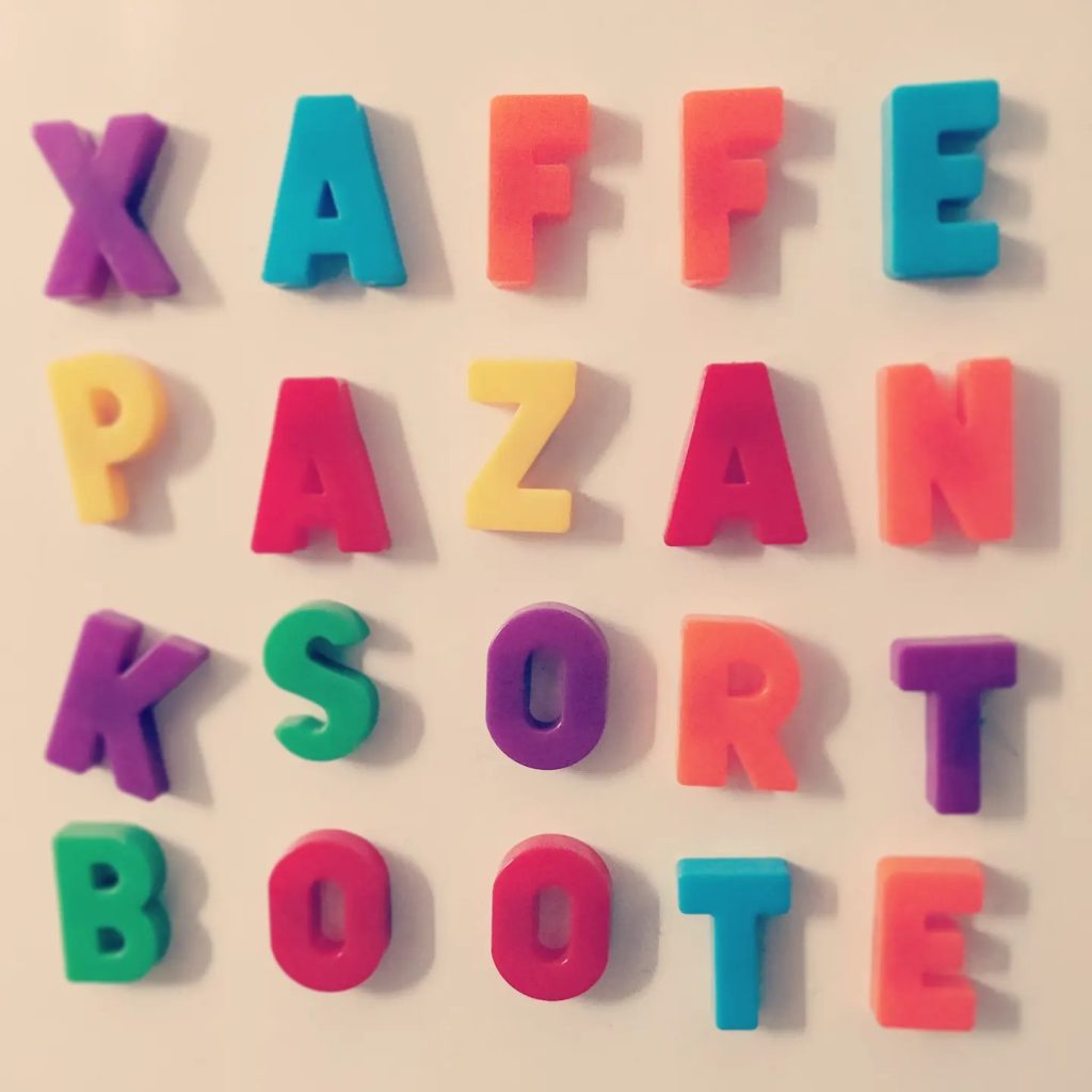 Ihr braucht lediglich ausreichend magnetische Buchstaben, schreibt damit ein paar einfache Wörter in ein Raster an der Magnetwand und setzt die anderen Buchstaben drumherum.